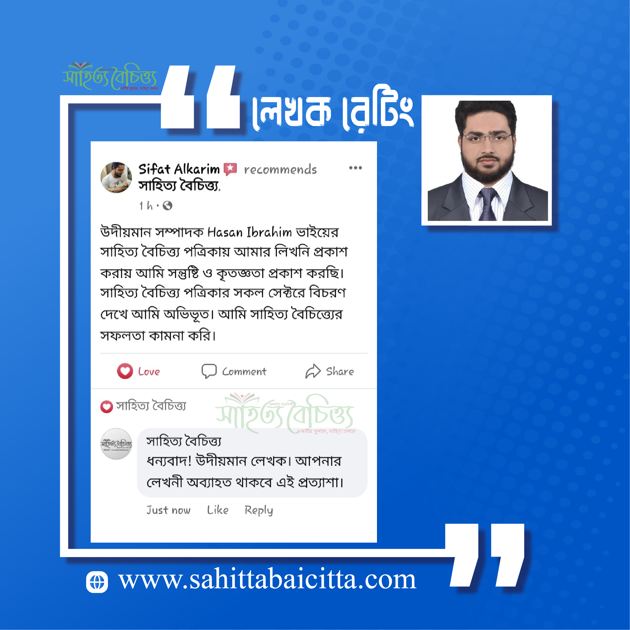 উদীয়মান সম্পাদক Hasan Ibrahim ভাইয়ের সাহিত্য বৈচিত্ত্য পত্রিকায় আমার লিখনি প্রকাশ করায় আমি সন্তুষ্টি ও কৃতজ্ঞতা প্রকাশ করছি।